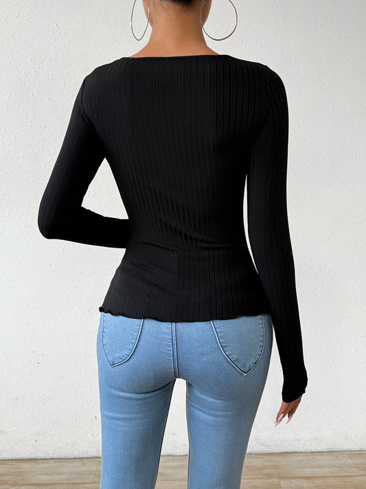 Decorative Button Contrast Round Neck Long Sleeve T-Shirt
